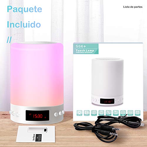 HERMOSAS LUCES – Toque la parte superior de las luces de noche altavoz bluetooth para cambiar el color de las luces. Como púrpura, rosa, azul, naranja. También puede ajustar el brillo de la luz blanca: luz baja, luz media y luz brillante. Estas hermosas y cálidas luces crean un ambiente romántico para su dormitorio.